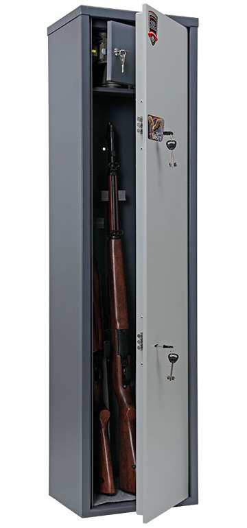 - В верхней части сейфа расположен трейзер (запирающееся на ключ отделение для патронов) размерами 197×356×118 мм. За узким трейзером остаётся свободное пространство, которое позволяет хранить ружья, по длине соответствующие высоте всего сейфа.